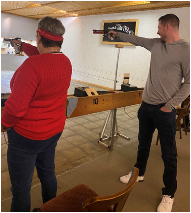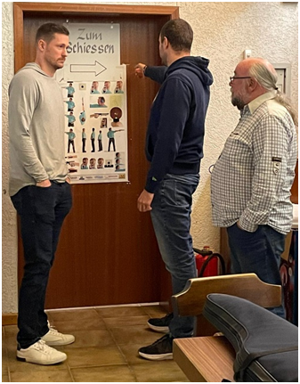 Die Broken Sticks Mannheim e.V., ein Fanclub der Adler Mannheim, hatten am 11.11.2023 im Vereinsheim der Schützengilde Heidelberg ihr alljährliches Club-Treffen. Auch der Spielerpate der Broken Sticks Tom Kühnhackl ließ es sich nicht nehmen vorbeizuschauen. Nach einer kurzen Führung durch unsere „heiligen“ Hallen und einem Crashkurs im Sportschiessen durfte der sportliche Aspekt natürlich nicht zu kurz kommen. Tom stellte seine Treffsicherheit erst mit dem Luftgewehr, dann mit der Luftpistole unter Beweis. Danach führten wir bei Kaffee, Tee und Kuchen anregende Gespräche über Eishockey, Sportschiessen und vieles mehr. Text und Bilder Jessica Hirscher